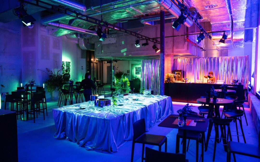 Für 70 geladene, namhafte Gäste aus der Branche wurde eine knapp 600 qm große, zweigeschossige Rohbaufläche in eine immersive Dinner und Eventwelt verwandelt. Ziel war es, das volle Potenzial der Venue erlebbar zu machen – nach innen wie nach außen.Großflächige Fensterfronten sorgten für starke Außenwirkung: Licht, Bewegung und Atmosphäre wurden bewusst eingesetzt und machten das Event so auch im Stadtraum sichtbar.